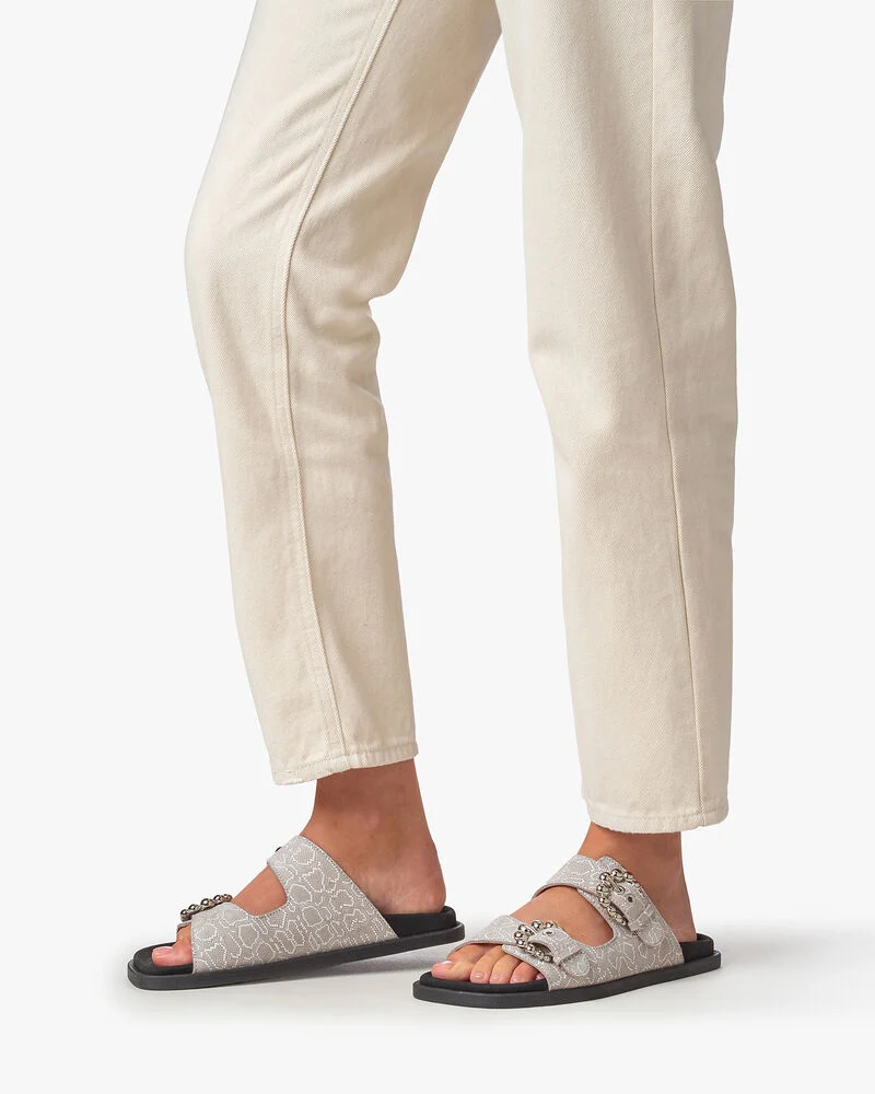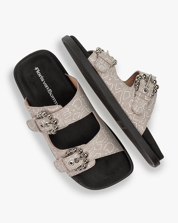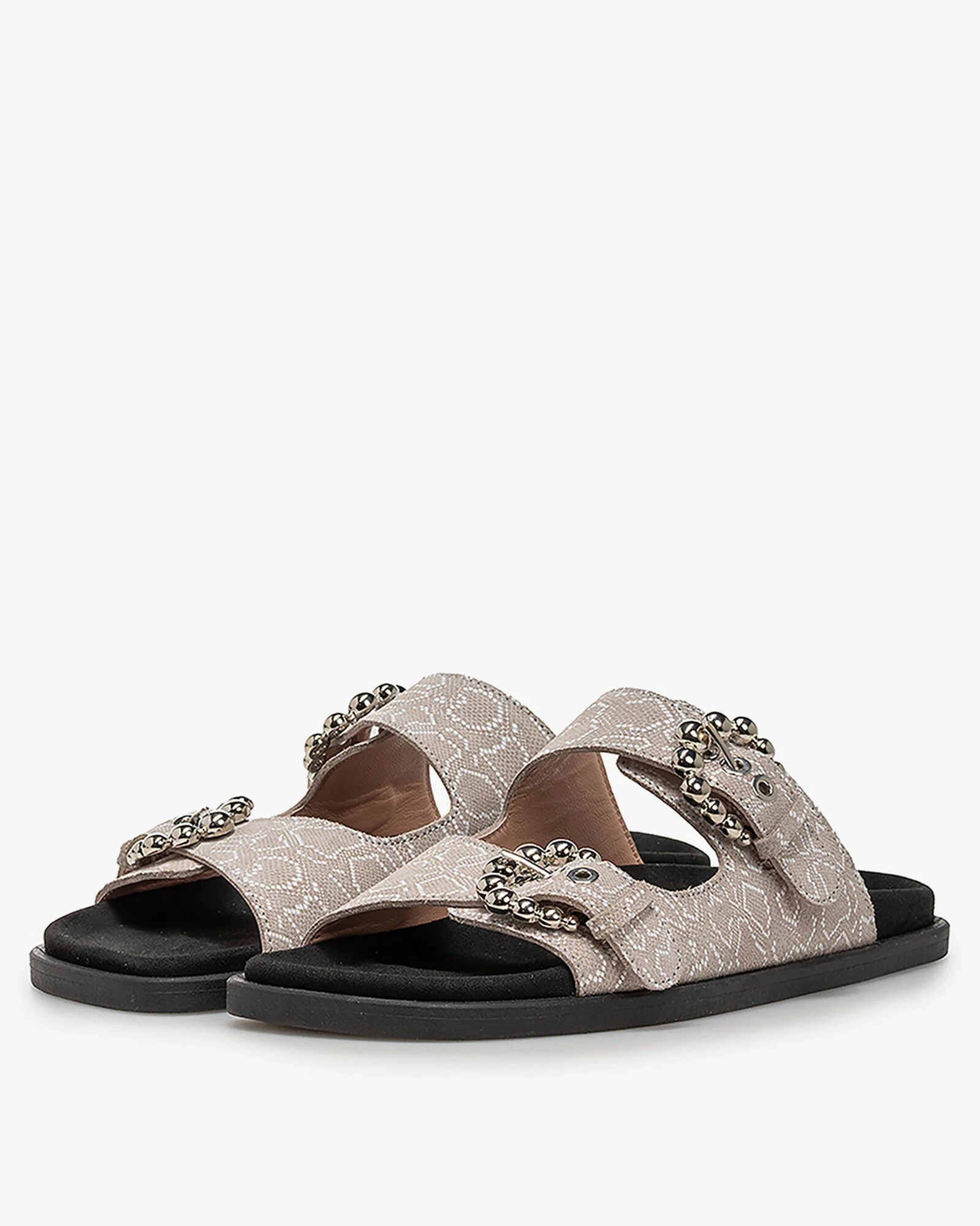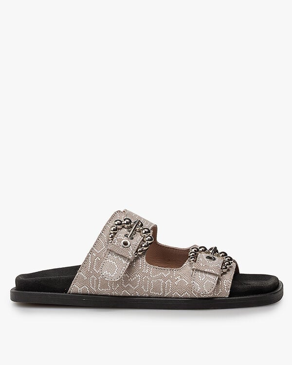 Deze soepele Gili-sandaal is ontworpen met een comfortabel, voorgevormd voetbed dat bekleed is met fijn zwart suède. De zool heeft een modieuze carrévorm en is aan de onderkant afgewerkt met een fijn antislipprofiel. Het bovenwerk is gemaakt van compact zandkleurig suède dat is gedecoreerd met een offwhite pythonprint. De bandjes sluiten met twee opvallende, oversized bubbel gespen. De banden zijn gevoerd met fijn geitenleer en het voetbed is niet uitneembaar.