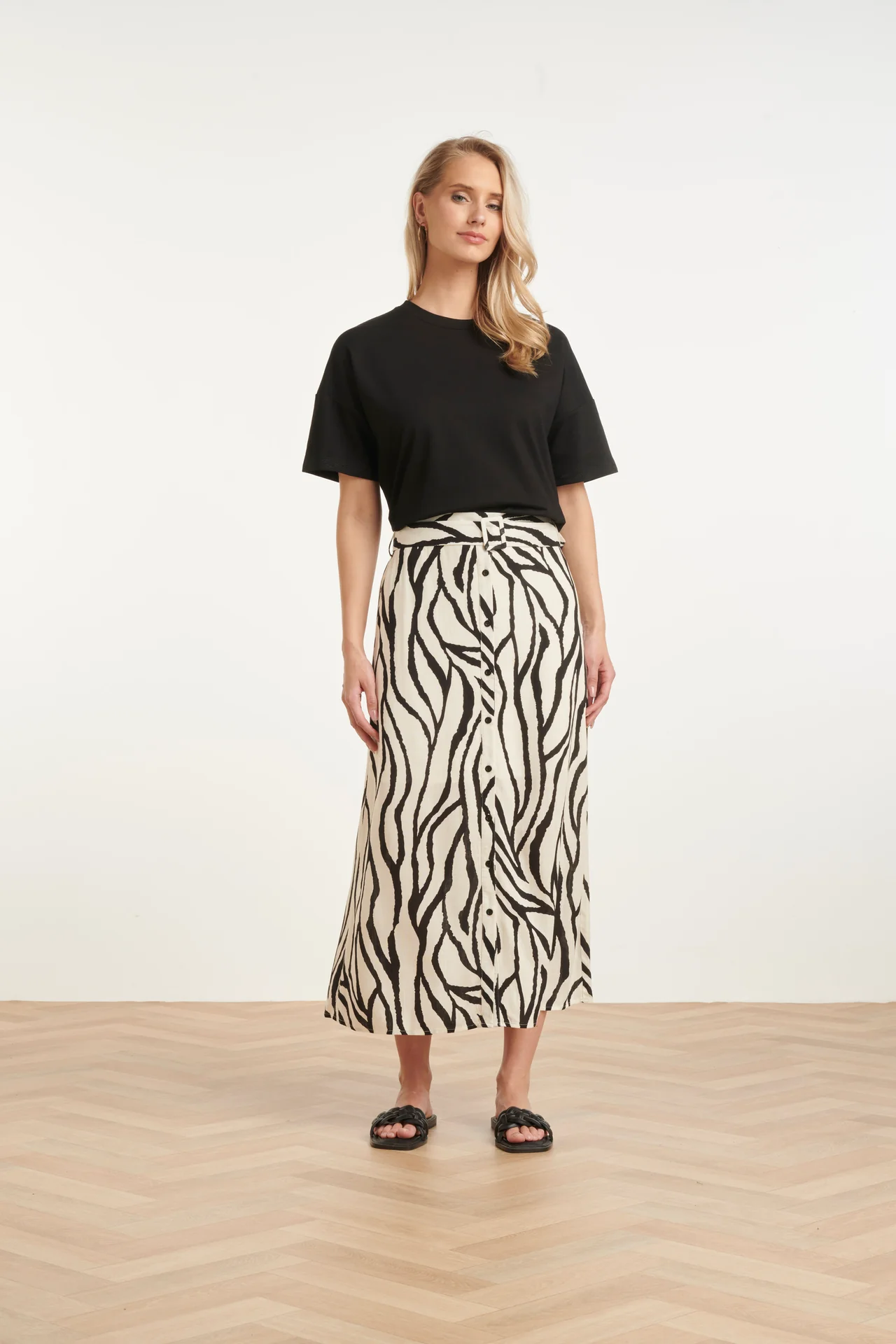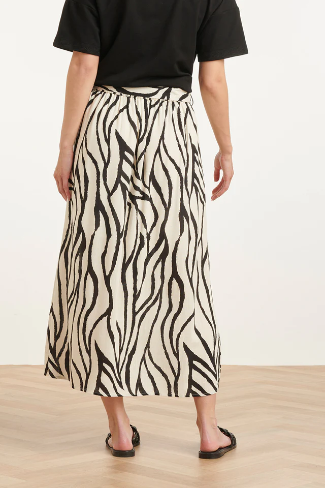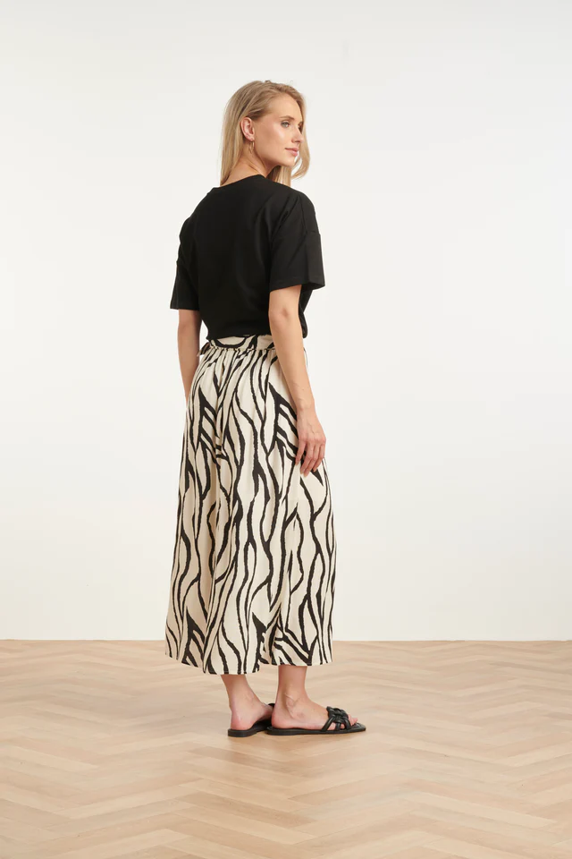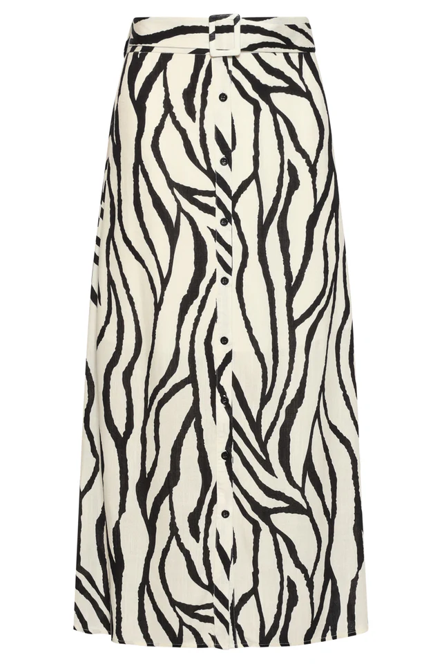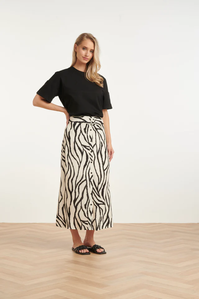 Maak een statement met deze elegante midi-rok van Smashed Lemon. Deze rok is uitgevoerd in dezelfde prachtige abstracte zebra print als de rest van de collectie, waardoor hij perfect is om als set te dragen of juist te combineren met een eenvoudige zwarte top. De knoopsluiting aan de voorzijde en de bijpassende ceintuur in de taille geven de rok een klassiek en vrouwelijk silhouet. Belangrijkste kenmerken: Vrouwelijk silhouet: De bijpassende strikceintuur accentueert de taille voor een flatterende pasvorm. Knoopsluiting: Voorzien van een stijlvolle rij knopen aan de voorzijde voor een moderne touch. Luchtig materiaal: Ideaal voor warme dagen dankzij de soepele en ademende stof.